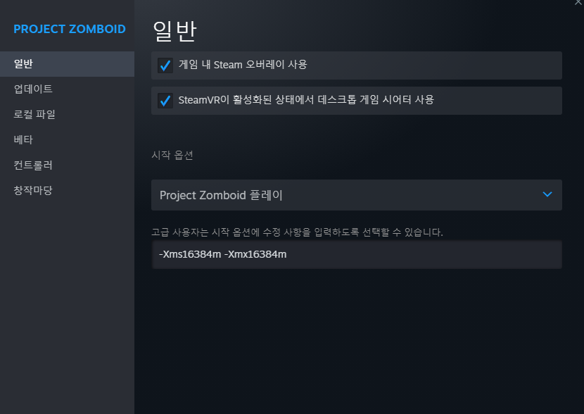 1. 스팀 > 좀보이드 우클릭 후 속성 > 시작 옵션에서 최대-최소 할당량 설정하기