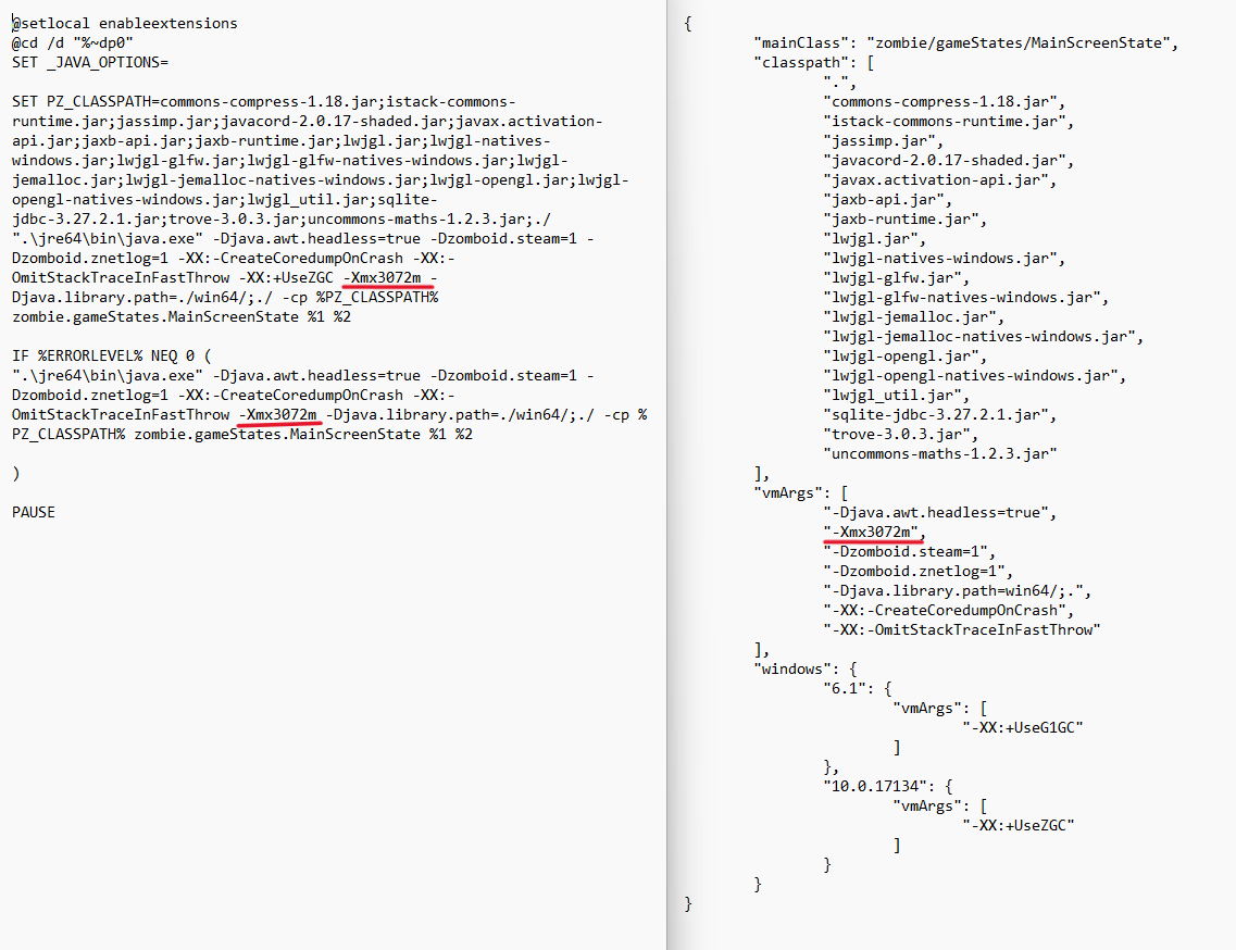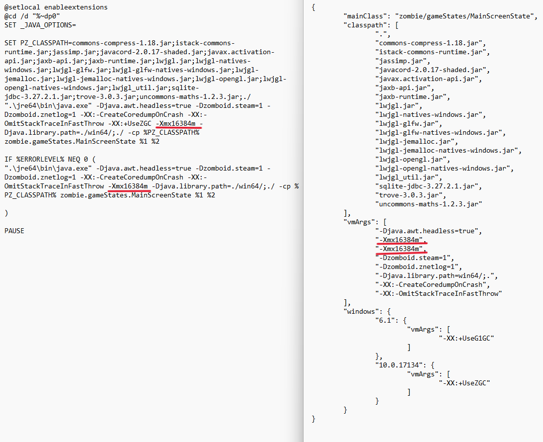 2. ProjectZomboid64.json / ProjectZomboid64.bat 파일 수정
