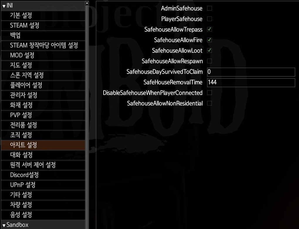 - SafehouseAllowFire - 체크 시 은신처에서 화재 대미지 활성화