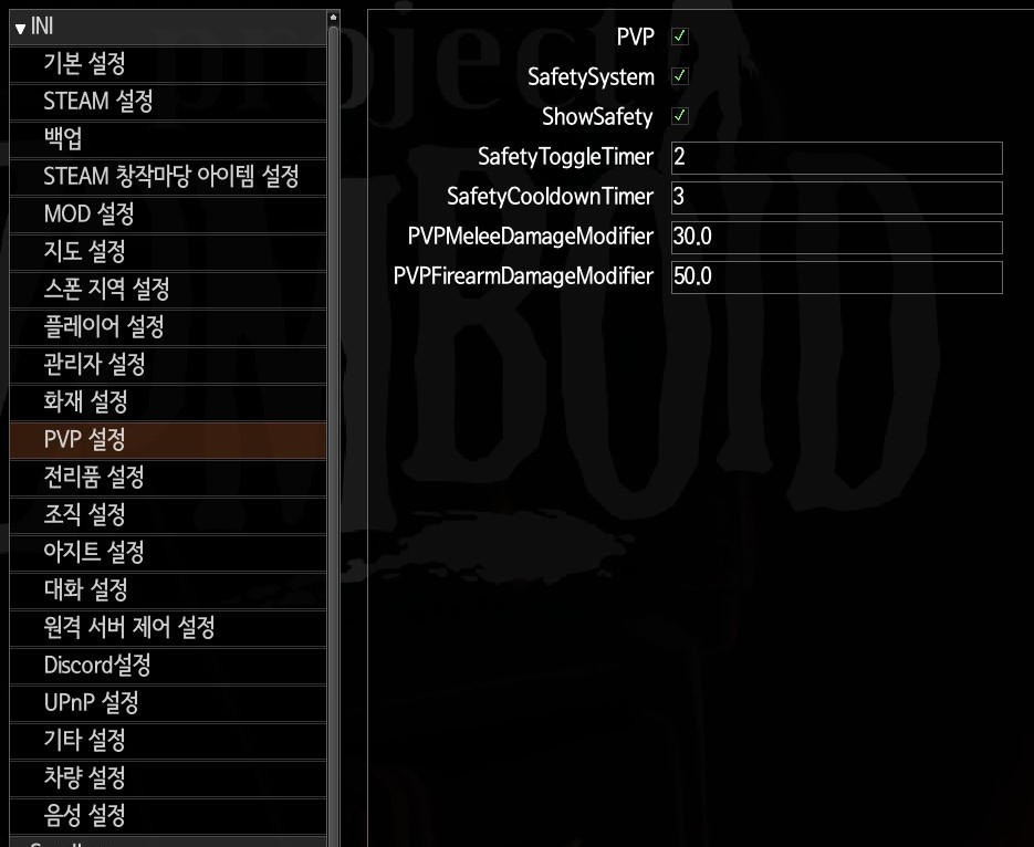 - PVPFirearmDamageModifier - PvP 시에 원거리무기의 추가피해량 설정 (기본값 : 50, 0~500까지 설정 가능)