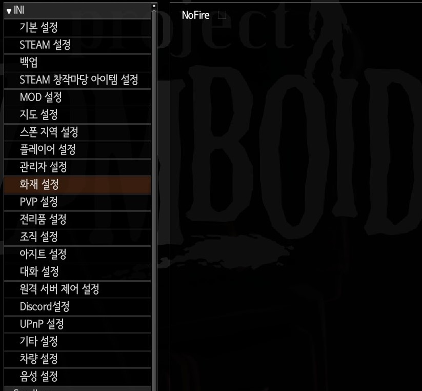 - NoFire - 체크 시 캠프파이어를 제외한 화재가 비활성화됨